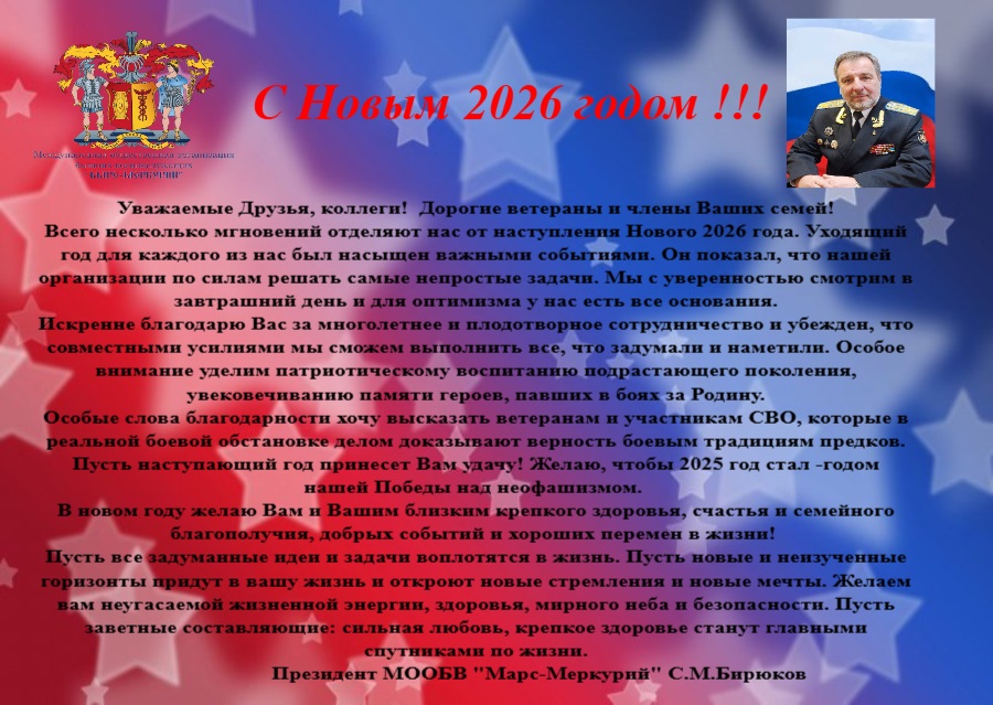 23.12 25 года в штаб-квартире Международной общественной организации бывших военнослужащих «Марс-Меркурий» состоялось очередное заседание Правления организации. Рассмотрели 6 вопросов, касающихся жизнедеятельности организации, такие как; работа МООБВ «Марс-Меркурий» в период проведения Специальной военной операции с докладом выступил Президент МООБВ «Марс-Меркурий» Бирюков С.М., утвердили План работы организации на 2026 год, с докладом выступил 1 вице-президент Комаров О.А., рассмотрели вопрос о взносах вступительных и ежегодных, внесли изменения: в название Ейское отделение- изменили на Краснодарское.