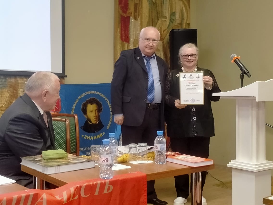 Председатель Тульского областного комитета Российского Союза ветеранов, член Тульского отделения МООБВ «Марс- Меркурий» Александр Павлович Лобанов вручил памятный знак Российского Союза ветеранов «Орден доблести» председателю Тульской региональной просветительской общественной организации «Знание» С.В. Гайдамаку, которого выбрали делегаты на 3-й пятилетний срок до 2030 года единогласно .
